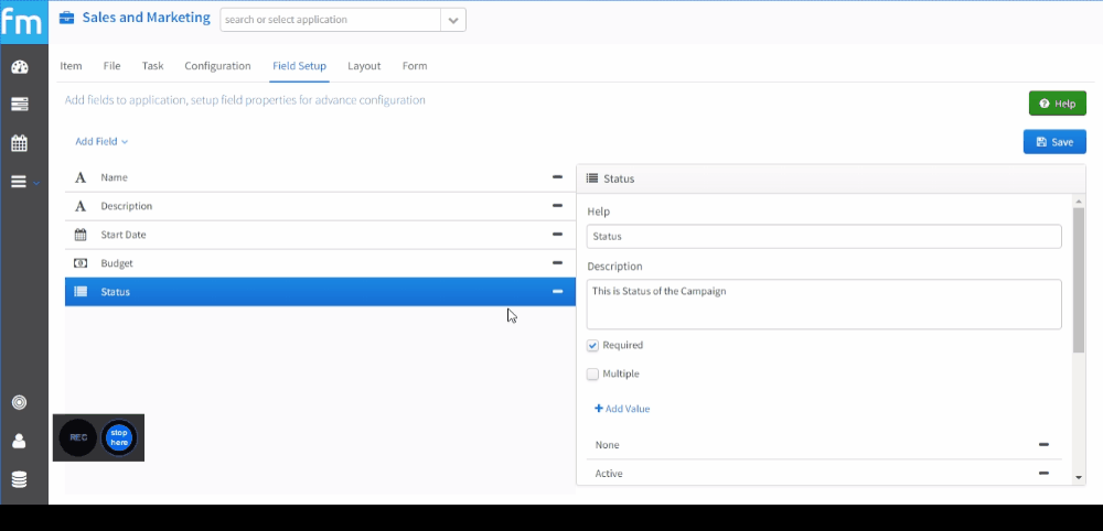 5. STATUS : Status field allows you to have some predefined values so that out of those one can be selected. You define those values using the Add Value configuration feature. List field makes it possible to select one or multiple values. List field configuration includes common features and two more features which is: