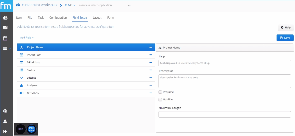 When you create an Application you do not have any field in that. Fusionmint provides you a wide set of fields to select from and to create your own customized apps. The Applications which are Installed from the App Store can also be customized as per the requirement that is more fields can be added to the Installed apps but the fields already present in the app template cannot be deleted. Here is the detailed description about the Fields :