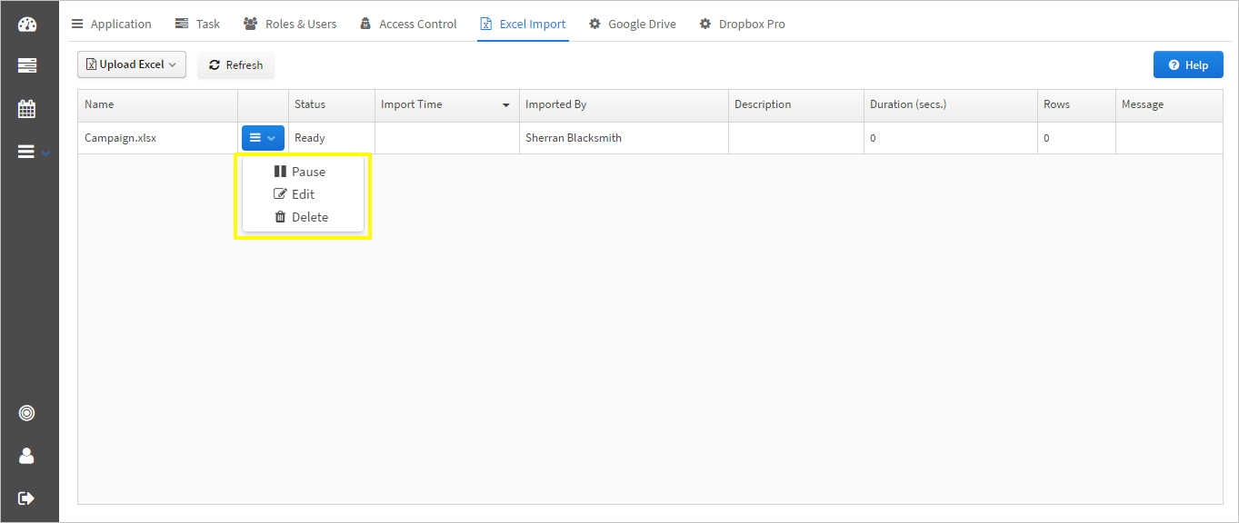 Once the import is complete, any changes made in the imported excel will get synced in the application as well, after every 5 minutes. In case you do not want the data to get synced in the application, click on the pause button available on the imported file under Excel Import tab (as in the image below).