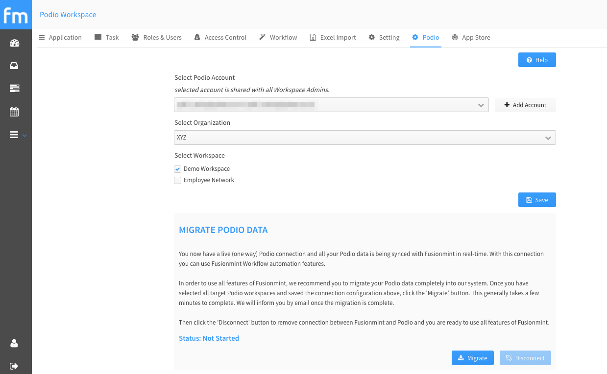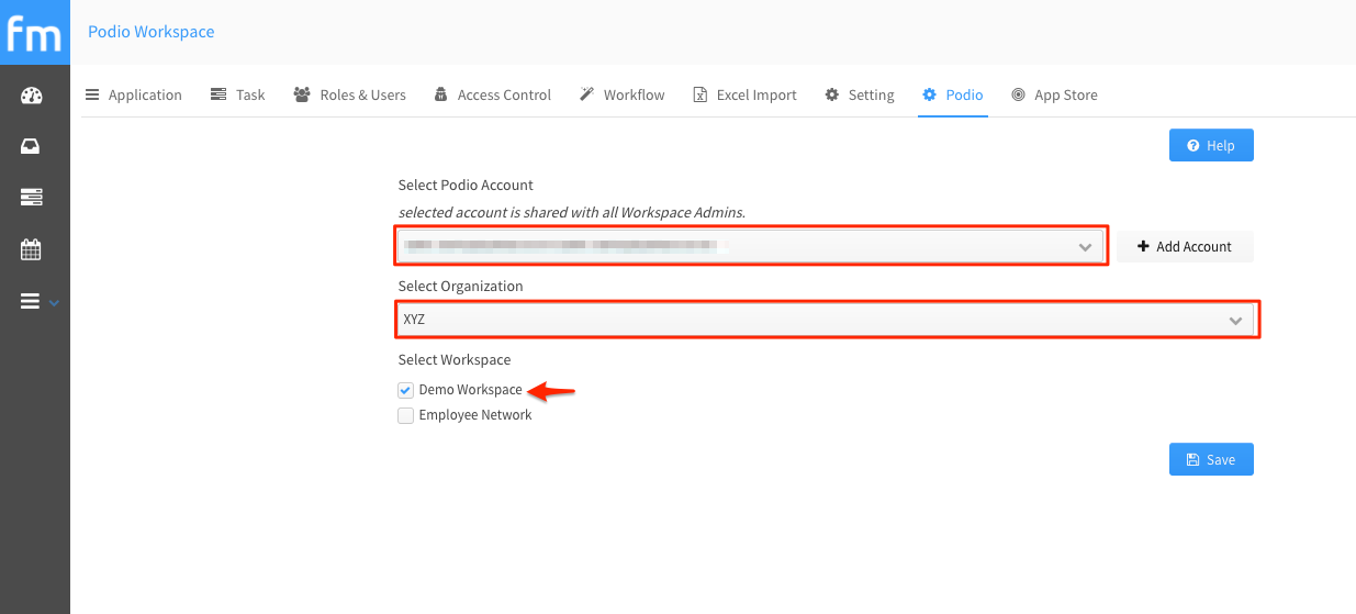 On selecting the account, you will see the Podio Organizations to which you have access. Select the target Organization and below that, you will see the list of Workspaces that you can select for integration with Fusionmint. After selecting all target Workspaces, click on Save button to save the configuration and complete integration.